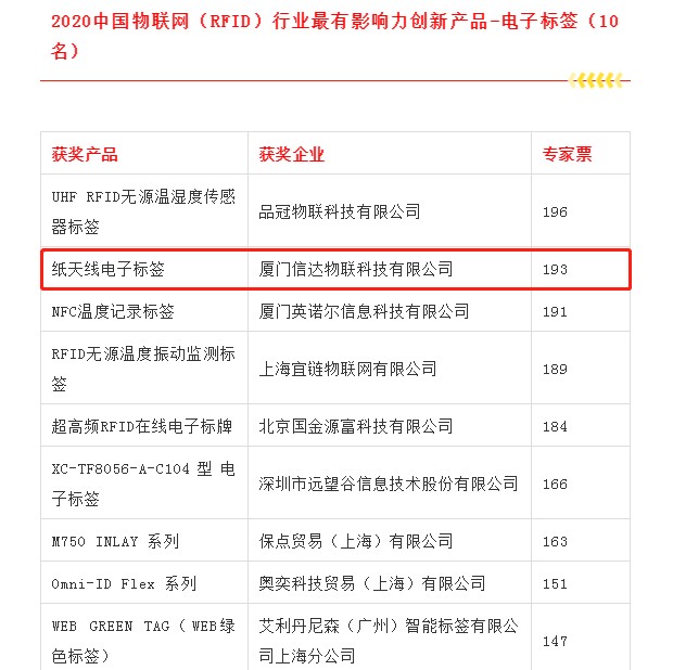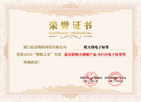 近期,物联网行业“奥斯卡”—2020物联之星中国物联网(RFID)行业年度评选,获奖名单正式出炉。 本届物联之星吸引了近400家物联网全产业链上的优秀企业参与评选,其中RFID领域有逾百家企业参选,并有600+评委参与投票,人气预热投票超过了120W人次,在行业内形成了广泛的影响。 信达物联历经大众投票预热、专家评委投票等环节,摘夺“2020中国最具有影响力AIOT企业奖”和“2020年中国物联网(RFID)行业最具有影响力创新产品奖”两项桂冠。